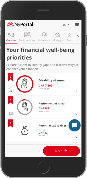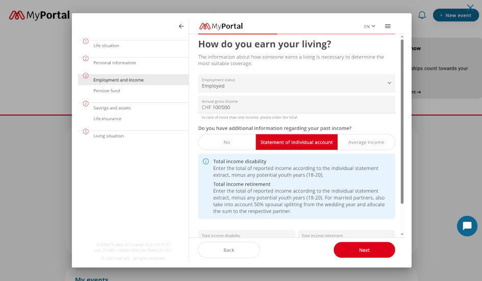 Thanks to the ELCA/Neosis iPension B2C portal, vlot has been integrated as a central service that transforms collected data into useful information for the financial wellbeing of insured persons, covering their needs in terms of risk, pensions and mortgages. Users engage with vlot's intuitive self-service modules to assess their personal coverage gaps, directly within the comprehensive iPension experience.
