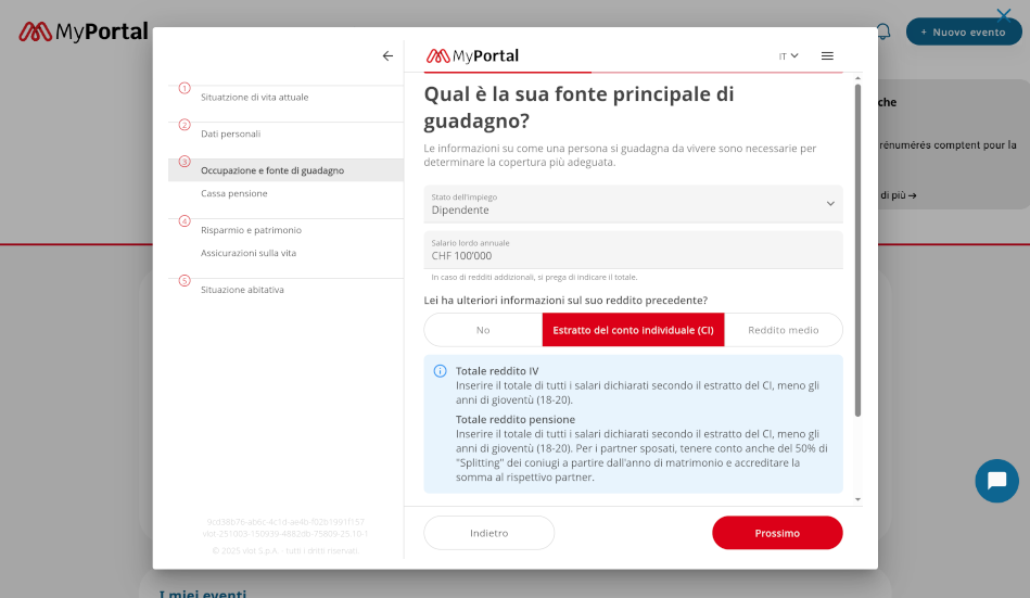 «Il dashboard previdenziale di vlot consente per la prima volta agli assicurati di generare una panoramica previdenziale chiara e completa su tutti i pilastri previdenziali per sé e per tutta la famiglia, comprese le raccomandazioni da seguire! Si tratta di un passo importante verso l'emancipazione degli assicurati.»Vai al use case- «vlot ci permette di integrare perfettamente un'analisi essenziale della situazione finanziaria e previdenziale dei nostri clienti nel nostro processo di consulenza. Questo ci permette di adempiere alla nostra responsabilità di fornire il miglior supporto possibile per il loro benessere e la loro protezione finanziaria, in particolare nel contesto dei nostri servizi di consulenza fiscale.»Vai al use case
