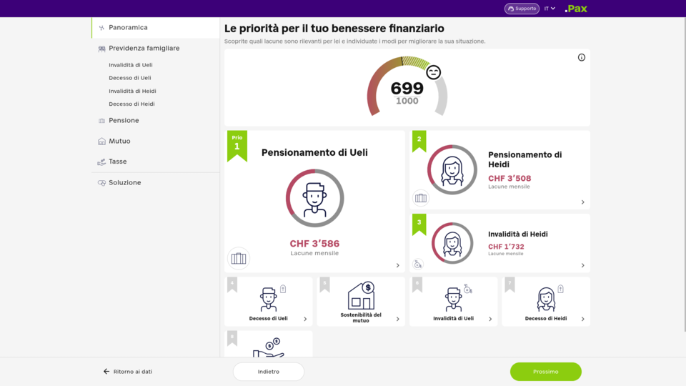 «Il dashboard previdenziale di vlot consente per la prima volta agli assicurati di generare una panoramica previdenziale chiara e completa su tutti i pilastri previdenziali per sé e per tutta la famiglia, comprese le raccomandazioni da seguire! Si tratta di un passo importante verso l'emancipazione degli assicurati.»Vai al use case- «vlot ci permette di integrare perfettamente un'analisi essenziale della situazione finanziaria e previdenziale dei nostri clienti nel nostro processo di consulenza. Questo ci permette di adempiere alla nostra responsabilità di fornire il miglior supporto possibile per il loro benessere e la loro protezione finanziaria, in particolare nel contesto dei nostri servizi di consulenza fiscale.»Vai al use case